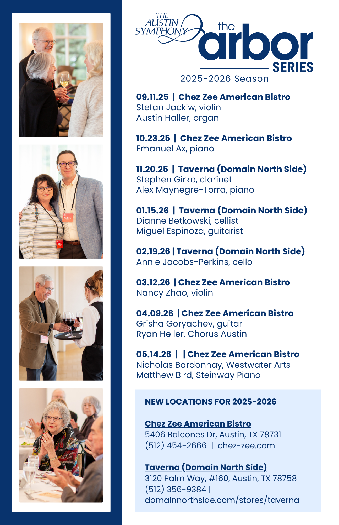 The Arbor Series offers Austin Symphony Orchestra donors at the 1911 Society level and above exclusive behind-the-scenes access to our Masterworks performances through elegant pre-concert luncheons.